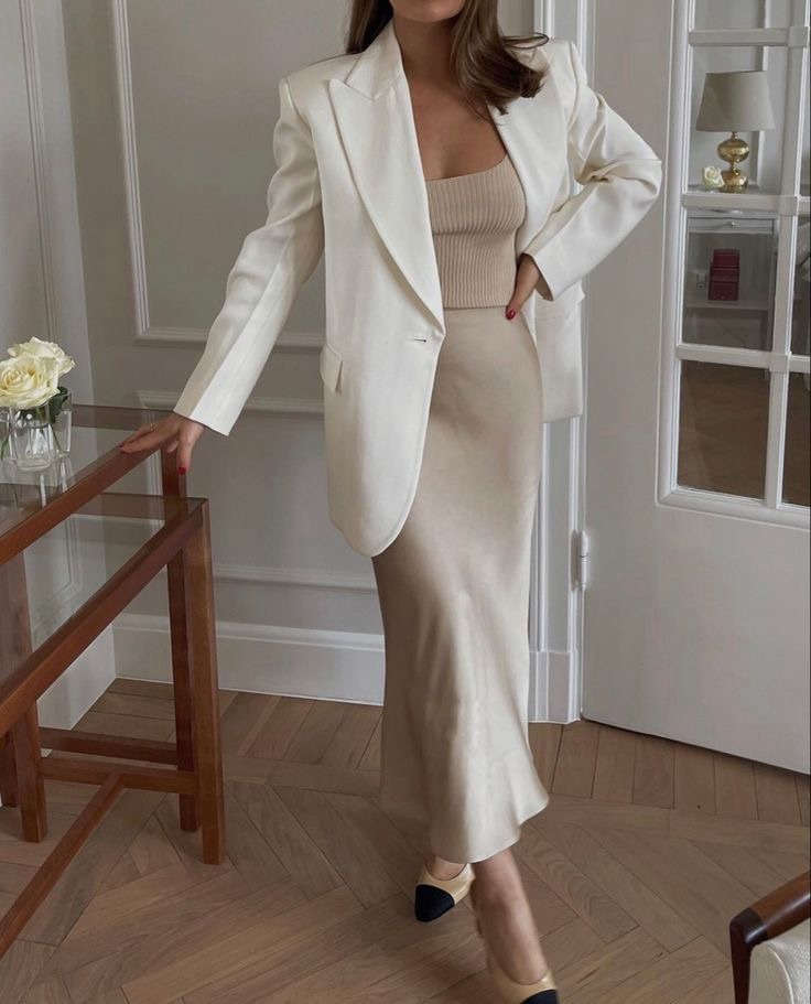 Mezcla de elegancia y comodidad: blazers con faldas suaves, pantalones anchos y tops delicados. Tonos neutros combinados con detalles metálicos o satinados. Ideal para un look profesional pero femenino.